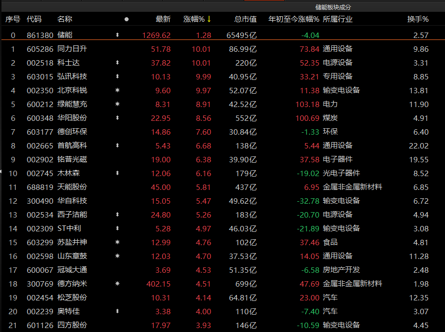 储能概念板块仍受到资金青睐,同力日升、科士达、弘讯科技、北京科锐涨停。宁德时代收涨1.49%报523.8元/股,比亚迪收涨1.18%报318.92元/股。