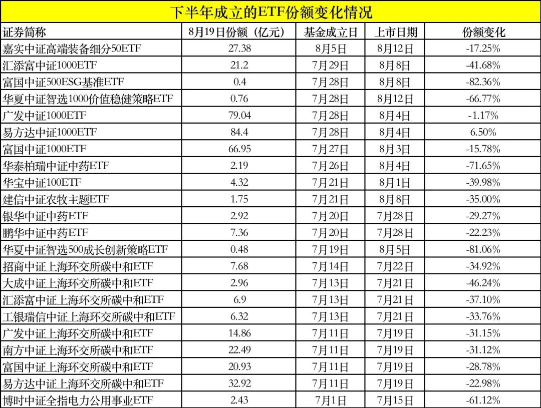 整体来看,今年以来成立的股票ETF基金中,截至目前有49只基金份额较成立时减少50%以上,在全部新成立ETF基金中占比超过64%。其中,缩水最快的ETF仅上市两个交易日,份额便减少过半;缩水比例最大的ETF上市两个多月份额仅剩不到5%。