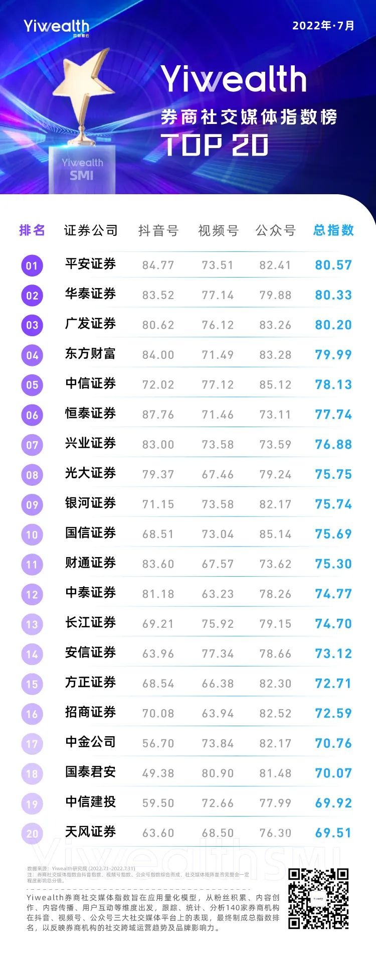 券商社交媒体格局总体依旧稳定。平安证券连续四次斩获总榜第一,创下新的“连胜”记录。同样值得注意的是,从6月总榜第8名一跃到7月总榜第2名的华泰证券。从7月数据来看,华泰证券视频号分榜排名第3,抖音和公众号分榜分别排名第5和第11名。