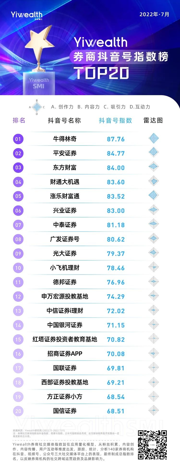 本期为券商社交媒体指数榜(2022年7月),分别从粉丝积累、内容创作、内容传播、用户互动等维度统计140家券商机构账号在抖音、视频号、公众号三大社交媒体平台上的表现,以反映其跨域运营趋势及品牌影响力。