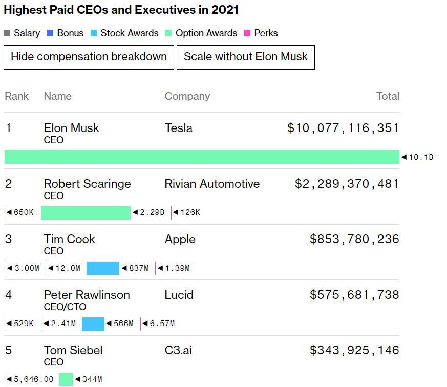据该薪酬榜单,排名第二的是电动汽车Rivan(RIVN,股价33.06美元,市值302.89亿美元)CEO罗伯特·斯卡林格,其薪酬为22.9亿美元。排名第三至第五的高管分别为苹果(AAPL,股价167.57美元,市值2.69万亿美元)CEO蒂姆·库克(薪酬价值为8.53亿美元)、电动汽车Lucid(LCID,股价16.1美元,市值269.32亿美元)CEO彼得·罗林森(薪酬价值为5.76亿美元)以及软件公司C3.ai(AI,股价19.11美元,市值20.48亿美元)CEO汤姆·希伯(薪酬价值为3.44亿美元)。