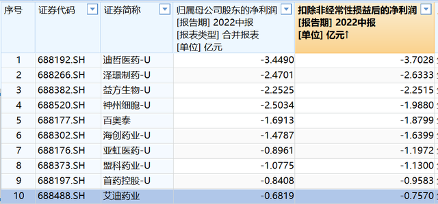 目前净利润亏损最高的是迪哲医药(688192.SH),上半年公司营收0元,净亏损3.45亿元,亏损同比扩大15.51%。迪哲医药主营业务从事恶性肿瘤和自身免疫性疾病领域创新药,目前公司核心产品仍处于临床开发阶段。