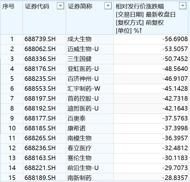 Wind数据显示,截至8月29日收盘,科创板生物医药领域97只股中,有36只股价破发,成大生物(688739.SH)、迈威生物(688062.SH)、三生国建(688336.SH)3只股的破发幅度居首,均超50%。