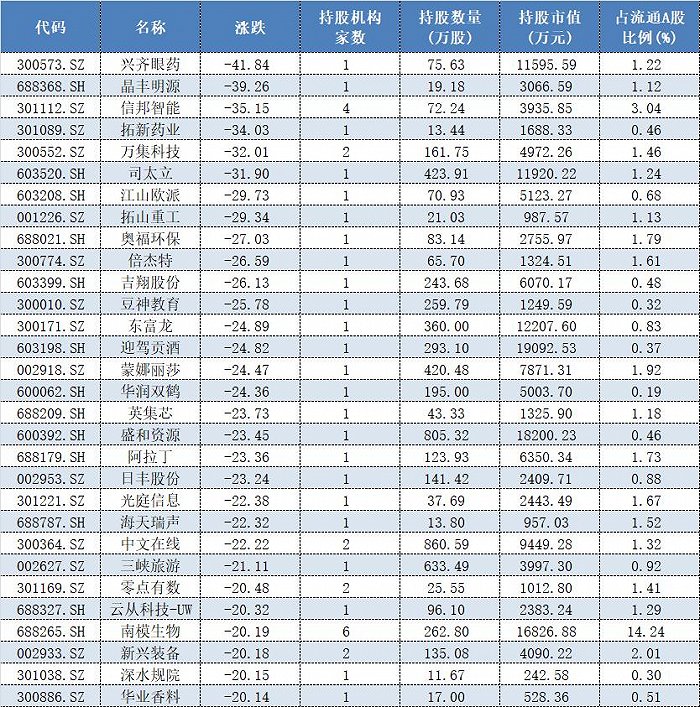 表格:私募中报新进持仓且7月以来跌幅超过20%的个股名单