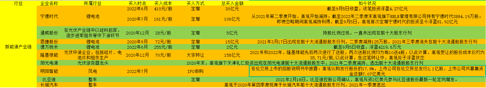 在新能源产业链领域,高瓴在A股的投资版图以新能源上游锂电池、下游整车领域为主。同时在光伏、风电领域,高瓴也有相应布局。