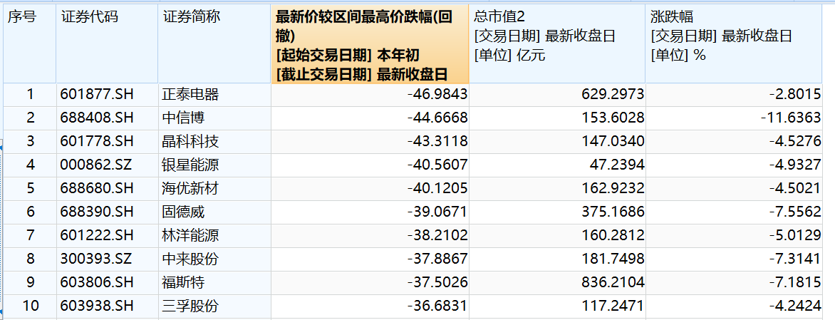 目前,已有不少前期涨幅高、涨速快的光伏股回撤超过30%。固德威、上能电气、爱康科技的最新收盘价较年内最高价,已经跌超30%。今日大跌之前,明冠新材、高测股份2只光伏材料、设备“新贵”的年涨幅均超70%,这两只股15日分别收跌13.9%、12.37%。