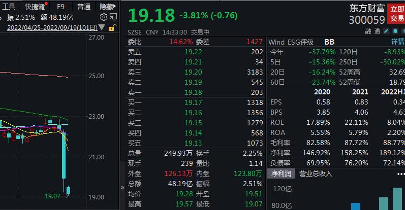 19日,东方财富低开低走,盘中一度跌超4%,主力资金5日累计净卖出38.71亿元。