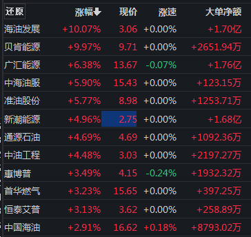 能源股表现不俗。油气开采及服务板块午后拉升,海油发展、贝肯能源涨停,准油股份、中海油服、广汇能源等跟涨。