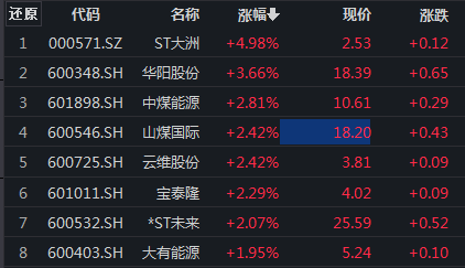 煤炭板块走高,华阳股份涨超3.6%,中煤能源涨近3%,山煤国际、宝泰隆、郑州煤电等跟涨。