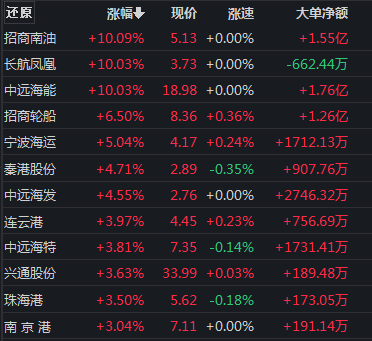 港口航运板块逆势走高,长航凤凰、招商南油等涨停,中远海特、招商轮船、兴通股份、宁波海运等跟涨。