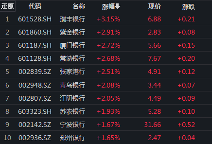 大金融板块护盘,瑞丰银行、紫金银行、常熟银行、江阴银行涨超2%,江苏银行、无锡银行、宁波银行等跟涨。