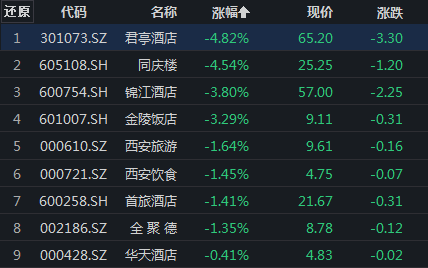 酒店餐饮板块领跌两市,同庆楼跌近5%,金陵饭店、西域旅游、大连圣亚、丽江股份等跟跌。