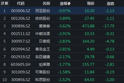 美容护理板块跌幅居前,百亚股份跌停,青岛金王、金三江、依依股份、爱美客等跟跌。