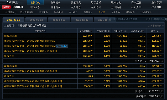 龙虎榜显示,9月21日买入五矿稀土金额最大的席位是“深股通专用”,买入金额达到了8975万元,占总成交比例6.36%,而华泰证券武汉武珞路营业部以2853.78万元的买入金额位列第二,国盛证券宁波桑田路营业部、华宝证券上海东大名路营业部,以及一家“机构专用”席位均有上榜;然而看卖出前五席位,排在第一的依然是“深股通专用”席位,卖出金额6677.22万元,这也使得该席位当天的净额为2297.78万元。买卖前五席位的买卖净差为6769.04万元。