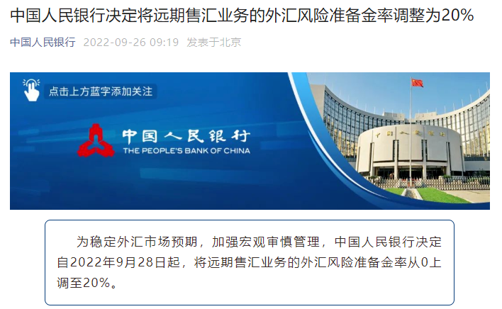 央行公告表示,为稳定外汇市场预期,加强宏观审慎管理,中国人民银行决定自2022年9月28日起,将远期售汇业务的外汇风险准备金率从0上调至20%。