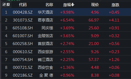酒店餐饮、旅游板块领涨两市,华天酒店涨停,众信旅游、君亭酒店、岭南控股、同庆楼、中青旅、西域旅游等跟涨。