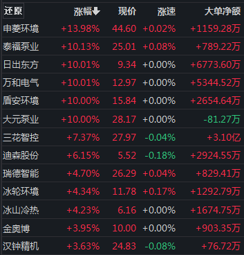 此外,空气能热泵板块涨幅居前,日出东方、万和电气、大元泵业、盾安环境涨停,泰福泵业、申菱环境涨超10%,迪森股份、瑞德智能、金奥博等跟涨。