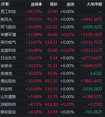 今早,储能板块掀起涨停潮。新风光、同飞股份20cm涨停,昆工科技涨超20%,申菱环境、英杰电气涨超10%,日出东方、英维克、德业股份、科达利、山东章鼓等个股涨停。