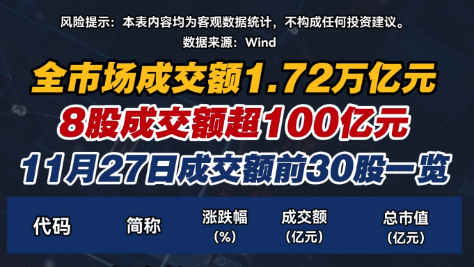 全市场成交额1.72万亿元 8股成交额超100亿...