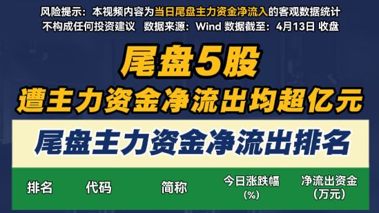 尾盘5股遭主力资金净流出均超亿元