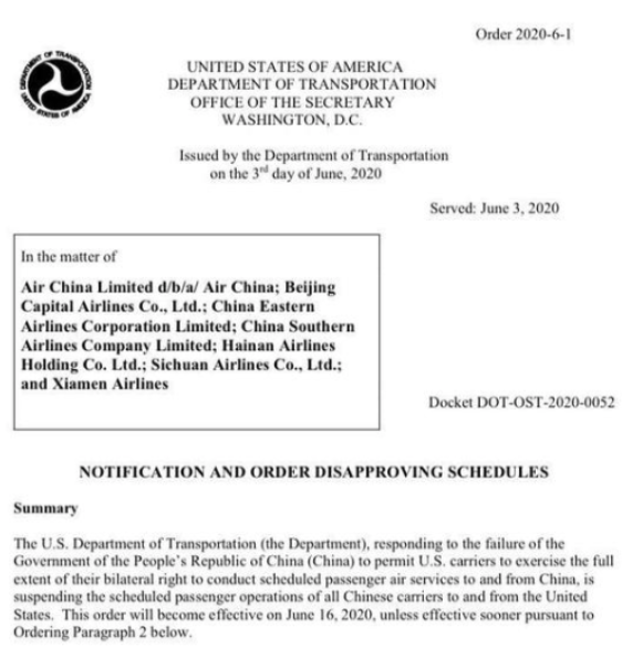 当地时间6月3日,美国交通部正式宣布,因中方没有允许美国航空公司提供往来中国的服务,美方将暂停允许中国航空公司提供来往于美国的航班,相关规定从当地时间6月16日开始执行,但仍有可能提前。