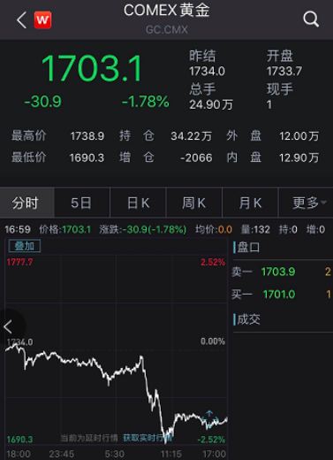 ADP数据公布后,黄金价格迅速跳水超2个百分点,价格一度下探至1690美元/盎司。