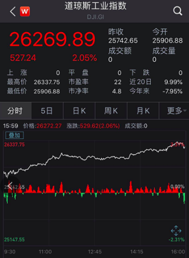 美股高开后继续迎接强力反弹。道琼斯工业指数上涨2.05%,时隔三个月后重新收复26000点关口。标普500指数上涨1.36%,纳斯达克指数上涨0.78%,距离3月23日的低点已累计反弹46%,距离历史最高点位的距离仅剩1.58%。标普指数和纳指均已实现日线4连阳。