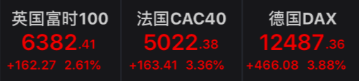 早前收盘的欧洲股市普遍收涨。英国富时100指数、法国CAC40指数和德国DAX指数分别上涨2.61%、3.36%和3.88%。当地时间3日晚,德国通过了规模达1300亿欧元的一揽子经济复苏计划,涉及儿童补贴、降税、扶持企业等救助措施。
