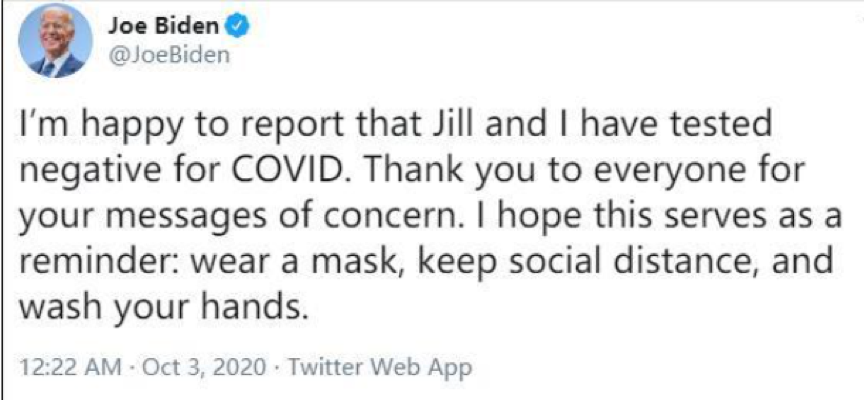 拜登2日在社交媒体上说,他和夫人吉尔接受了新冠病毒检测,结果均呈阴性。拜登竞选团队随即宣布,拜登仍按原计划于当天在密歇根州举行竞选活动。