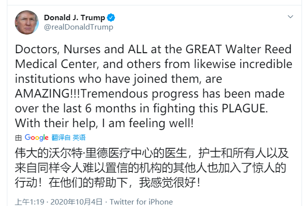 在医生宣布最新状况之后,特朗普立马发推称:“伟大的沃尔特·里德医疗中心的医生,护士和所有人,还有来自其它非常棒的医疗机构的其他人,过去半年战胜这场瘟疫取得了巨大进展。在他们的帮助下,感觉很好”。