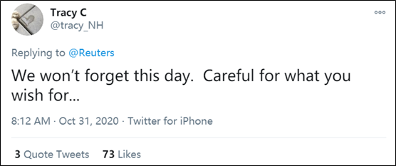 这个带有“抛弃特朗普”、认定特朗普即将败选的造型,很快引起了大家的讨论。反感特朗普的网民纷纷叫好,而特朗普的粉丝则大为光火。在路透社报道这一新闻的推特链接下,第一条评论就是一个特朗普粉丝在对蜡像馆“撂狠话”:“我们不会忘记这天的,你们都小心点!”