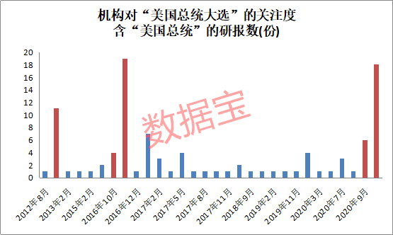 从舆情热度来看,研究机构有关“美国总统大选”的话题也会在竞选前十分火热。从涉及“美国总统”的研究报告数量看,2016年、2020年竞选当月和前一个月均出现了高峰。