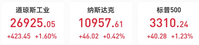 美股三大股指在周一全线收高,其中道指涨超400点,和标普500指数一同录得较大涨幅,分别上涨1.6%和1.23%,纳指小幅收高0.42%。