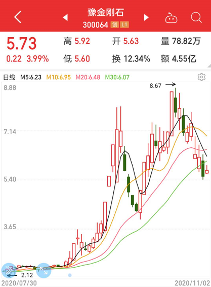 引发监管层关注的是豫金刚石无业绩支撑的大涨。在前三季度亏损4.81亿元的情况下,公司从8月21日开启狂欢模式,截至10月21日,豫金刚石股价从2.31元/股涨至8.67元/股,累计涨幅达到270%以上。(数据宝 梁谦刚)