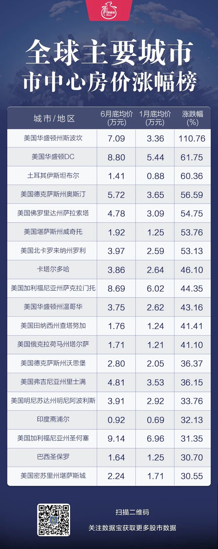 流动性泛滥之下,美国楼市迎来了惊天大涨。上半年全球房价涨幅最大的10个城区,就有8个来自美国,涨幅榜前二十有16个城区来自美国。美国华盛顿DC市中心公寓过去不到半年时间房价上涨近62%位居全球第二位。