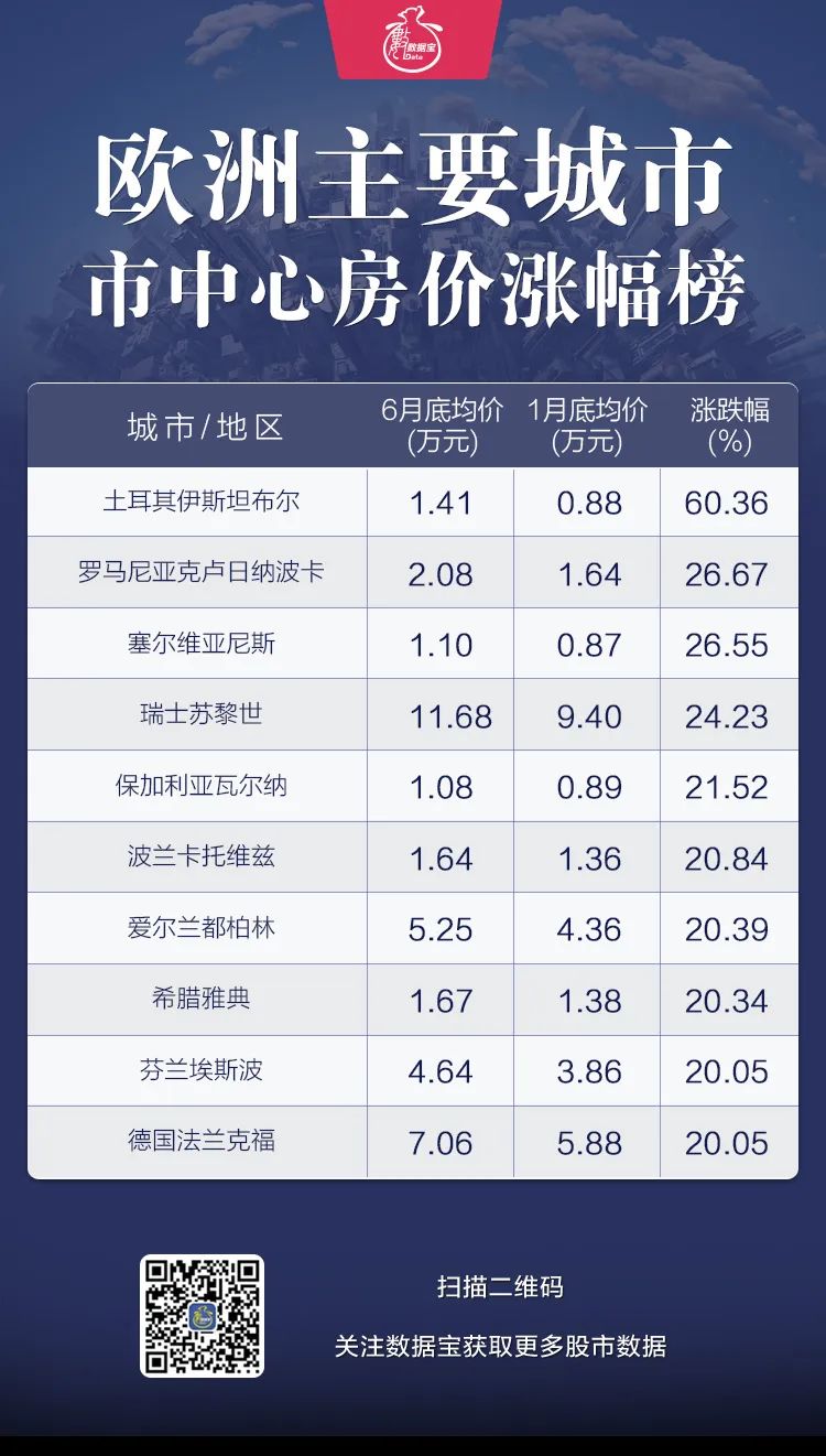 数据宝统计,土耳其伊斯坦布尔成为欧洲房价涨幅最大的城市,市中心均价从1月底的8782元涨到6月底均价14083元,涨幅超60%位居全球第三欧洲第一。欧洲房价涨幅第二名是罗马尼亚克卢日纳波卡,均价从1.64万元涨到2.08万元,涨幅超过26%。