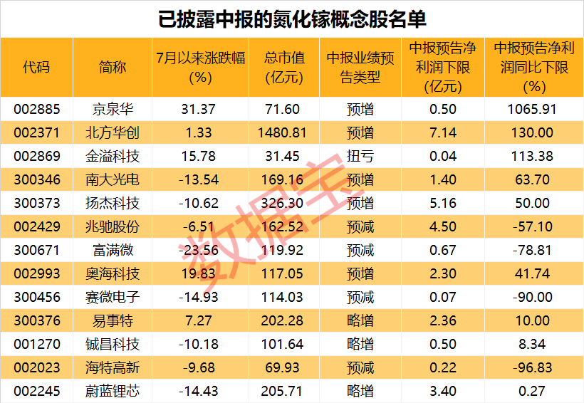 13只氮化镓概念股已经抢先发布中报业绩预告,京泉华、扬杰科技、南大光电等上半年业绩预增,金溢科技上半年业绩扭亏。