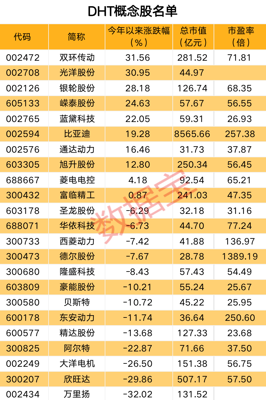 证券时报·数据宝统计,A股中DHT技术相关的产业链上市公司有23家,今年以来股价平均下跌0.14%,双环传动、光洋股份涨幅居前,年内累计上涨幅度均超30%。