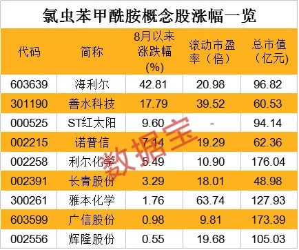 善水科技8月8日股价20CM涨停,公司旗下2,3-二氯吡啶是美国杜邦公司明星专利杀虫剂产品氯虫苯甲酰胺(又名康宽)的核心原材料,现有产能550吨,在建8000吨。