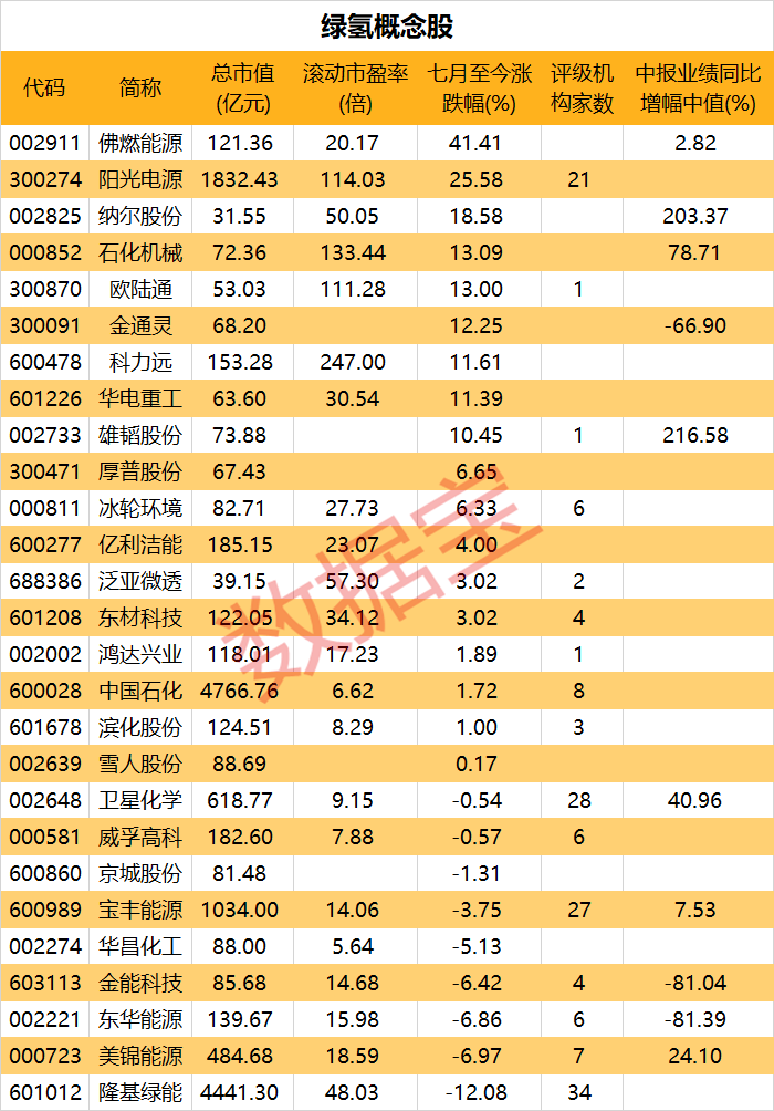 证券时报·数据宝统计,A股绿氢概念股27只。七月以来,概念股普遍上涨,平均涨幅5.24%。9股涨逾10%,佛燃能源涨幅居首,高达41.41%;阳光电源随后,累计涨幅超过20%。回撤个股不多,幅度也较小,仅隆基绿能一股跌幅超过10%。