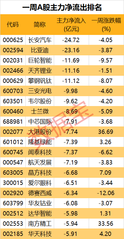 剔除近一月上市新股,5股净流出额逾10亿元。两大汽车龙头,长安汽车和比亚迪均遭到主力23亿元以上资金抛售。主力也相继出走多只电子板块热门股,三安光电、韦尔股份和士兰微净流出额均在8亿元以上。
