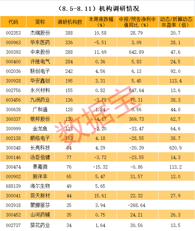 数据宝统计,近一周机构调研的上市公司中,按照中报或中报预告中值计算,永兴材料、新洋丰、葵花药业、健盛集团等个股净利同比增长超30%且折算动态市盈率低于20倍。其中,藏格矿业和健盛集团两只个股折算动态市盈率均不足12倍。