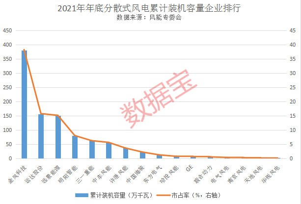 风能专委会近期公布的《中国风电产业地图2021》数据显示,截至2021年年底,风电整机制造企业累计共16家,其中分散式风电累计装机容量超过50万千瓦的整机企业有金风科技、运达股份、远景能源、明阳智能、三一重能、中车风电,这6家企业分散式风电累计装机容量合计为890.8万千瓦,占分散式风电累计装机容量的89.4%。