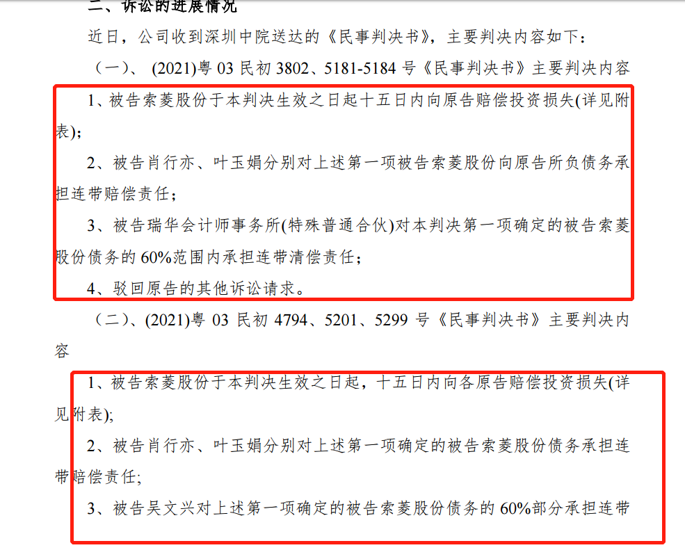 判决书均判定,索菱股份需在判决书生效之日起15日内赔偿投资者损失,索菱股份时任高管、实控人肖行、叶玉娟等人也被判承担连带赔偿责任,瑞华会计师事务所(特殊普通合伙)也被判承担连带清偿责任。