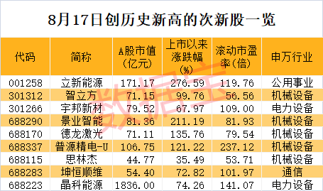 截至8月17日收盘,次新股整体A股市值4.33万亿,其中中国电信、晶科能源、C海光、龙源电力等市值超千亿。主营光伏组件的龙头晶科能源今日盘中创历史新高,收盘时股价回落,最新A股市值1836亿元,4月27日以来该股累计反弹幅度达到73.28%。
