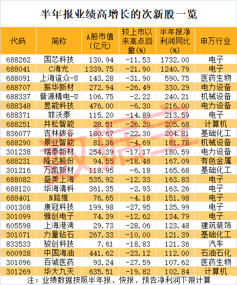 从估值水平来看,截至8月17日收盘,上述半年报业绩增长的次新股中,滚动市盈率低于30倍的有30只。中国海油市盈率7.83倍排在最低位置,公司业绩预告显示,2022 年上半年得益于国际油价走高、产量增长及成本管控,公司盈利水平大幅提高,预计上半年净利润为705亿元至725亿元,同比增长112%至118%。