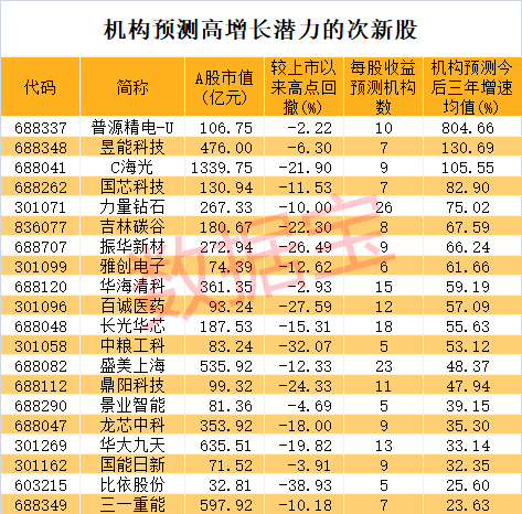 从机构关注度来看,27股获得5家以上券商研报覆盖。其中诺唯赞、中国移动、力量钻石、盛美上海、时代电气最受机构青睐,20份以上研报提及这些股票。按照5家以上机构一致预测数据,20只次新股今后三年净利润增速均有望超过20%。