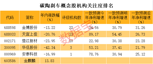 从未来增长潜力来看,22家机构评级的金博股份今年、明年及2024年机构一致预测净利润增速均超30%;13家机构评级的天宜上佳三年机构一致预测净利润增速均超25%;10家机构评级的楚江新材三年机构一致预测净利润增速均超25%。