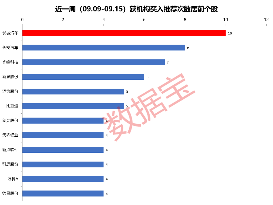 数据宝统计,共计29股获3次及以上机构评级。由于汽车板块集体披露八月产销情况,机构关注度居前的多为汽车整车股。其中,长城汽车以10次评级居于首位;长安汽车、光峰科技、新泉股份、比亚迪、迈为股份的机构评级数量亦不少于5家。