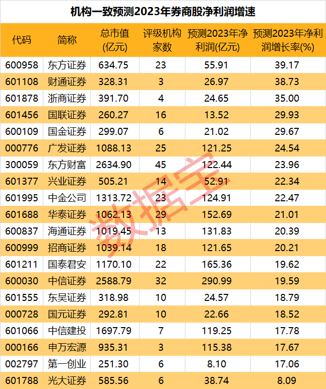 数据宝统计,根据3家及以上机构一致预测,12只券商股明年净利润增速有望突破20%。中信证券全年利润或将逼近300亿元大关,龙头地位进一步凸显;东方证券、财通证券、浙商证券全年有望实现同比35%以上增长。